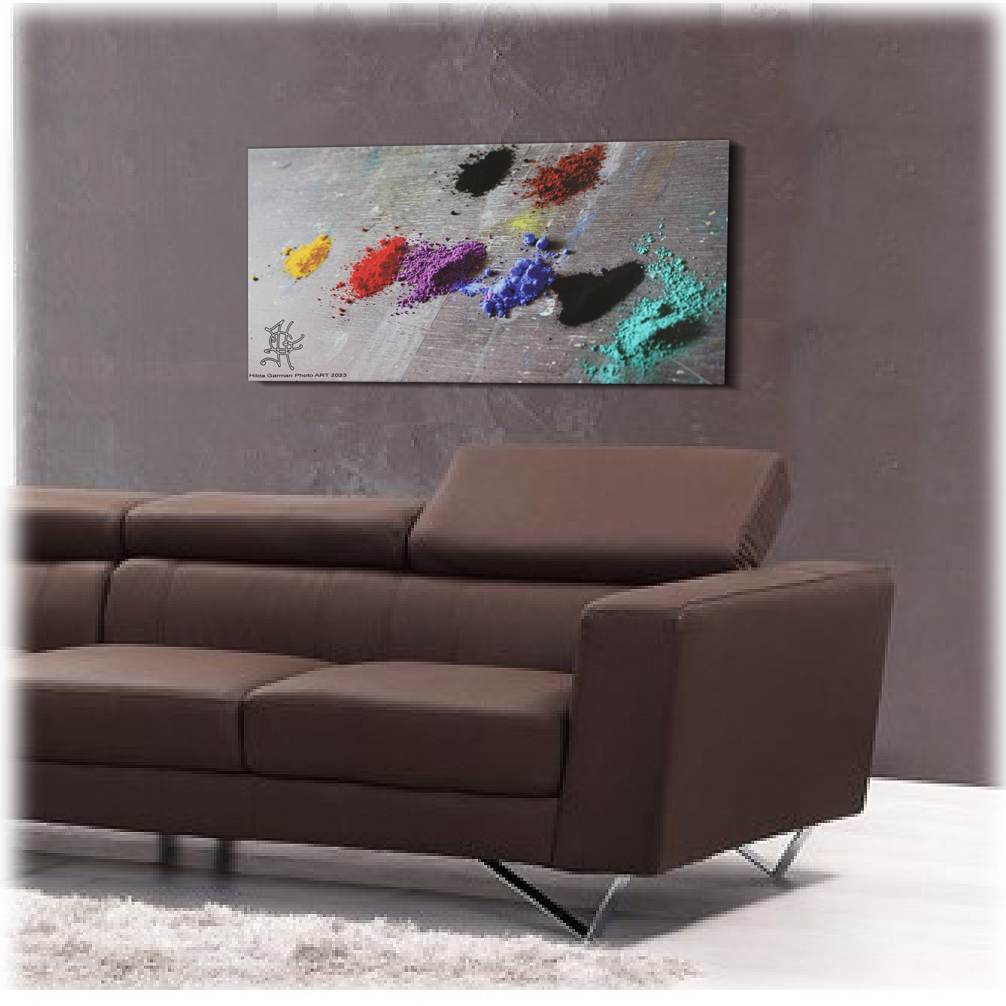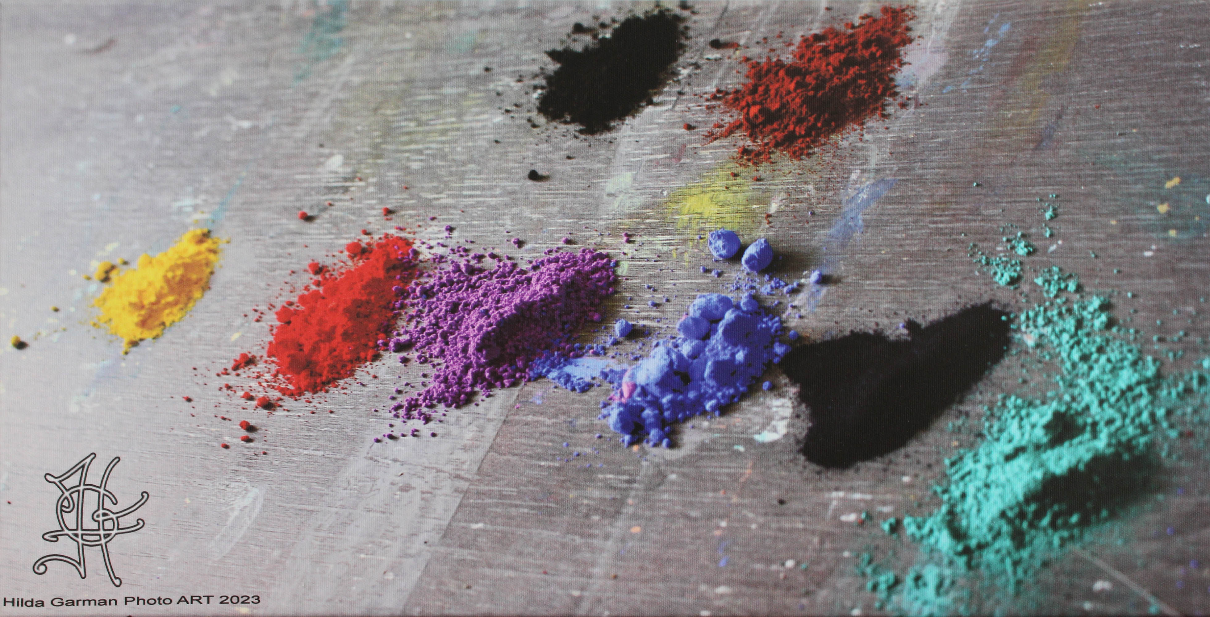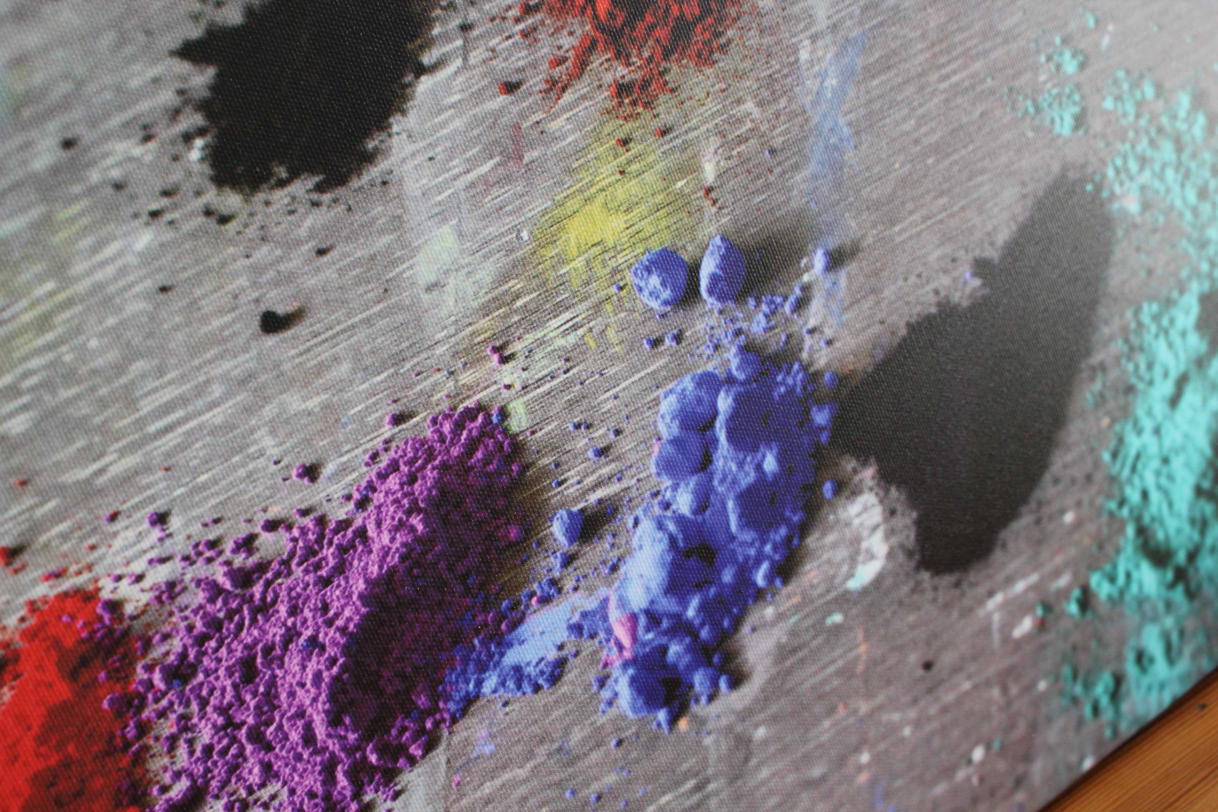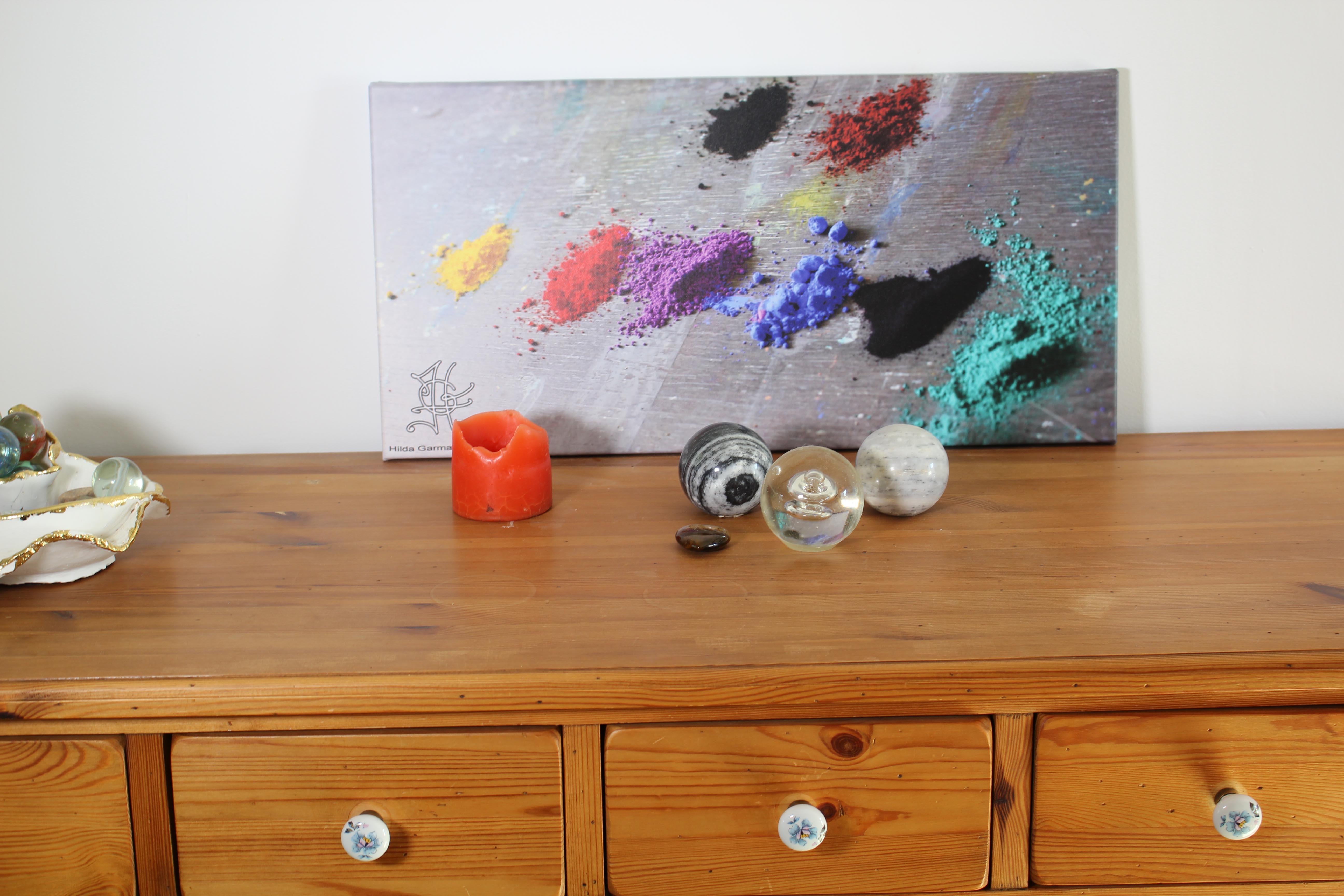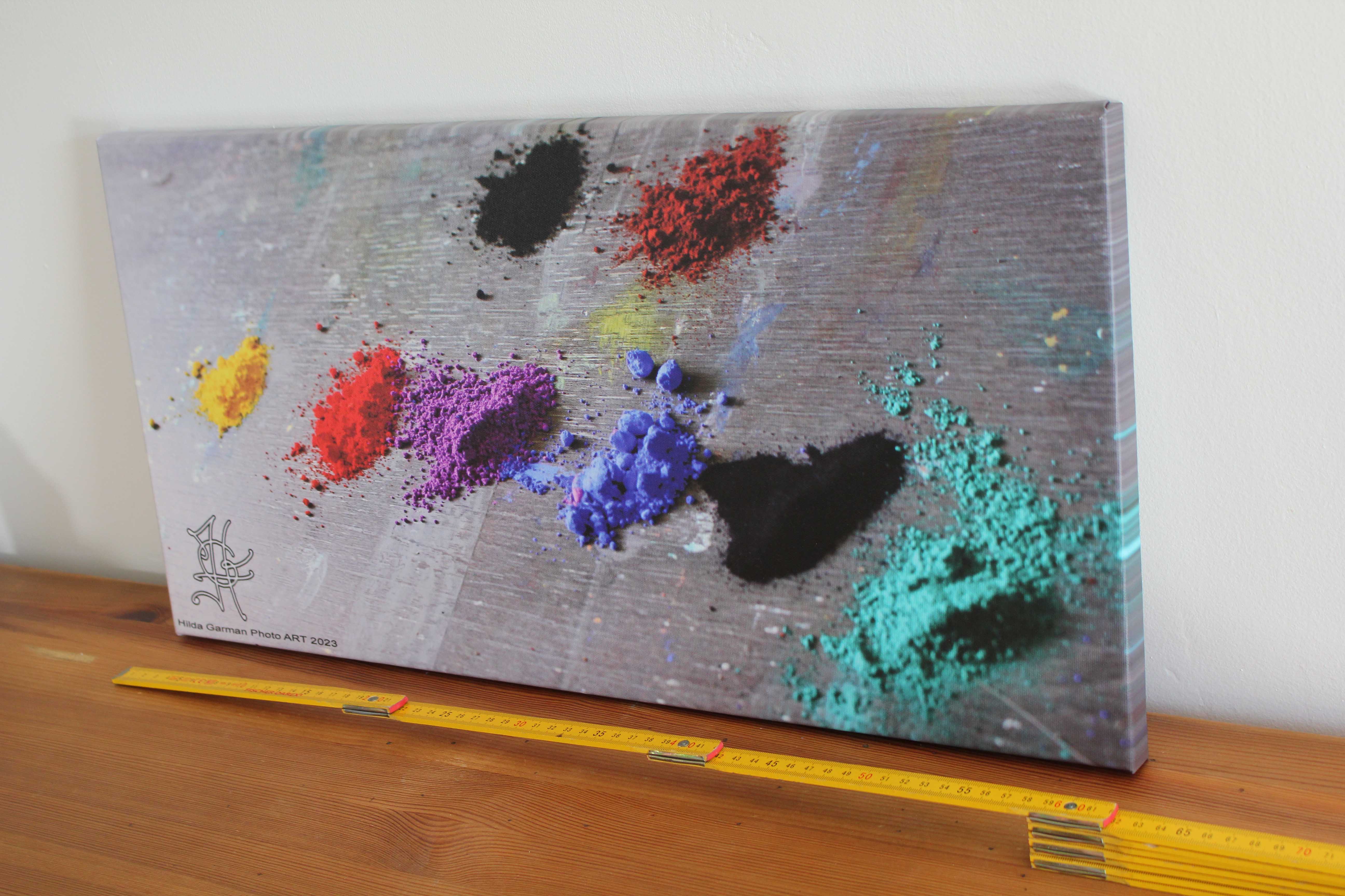 Photo faite dans l’atelier, imprimée sur toile de coton de haute qualité, encres latex anti UV et sans solvant, et tendue sur châssis. Cette toile représente des pigments posés sur la table de l’artiste et prêts à être mélangés aux liants. Taille disponible 30 X 60 x 2. Idée rare. Délais d’expédition 2 jours ouvrés. Livraison inclue à l’intérieur de l’EU.