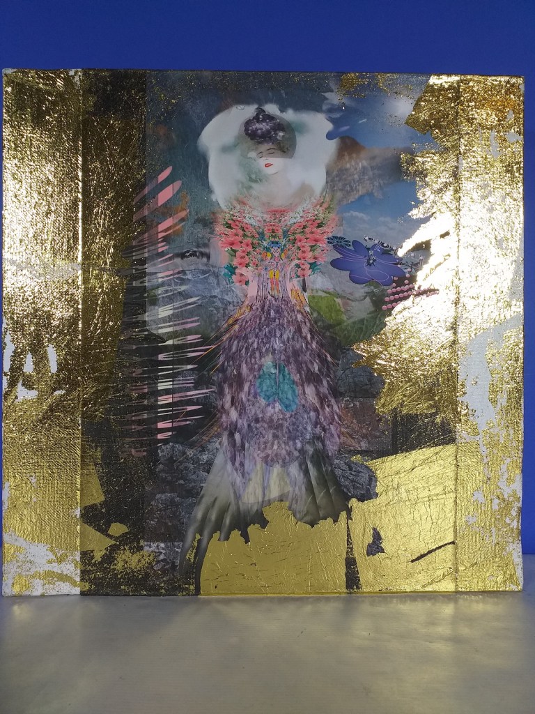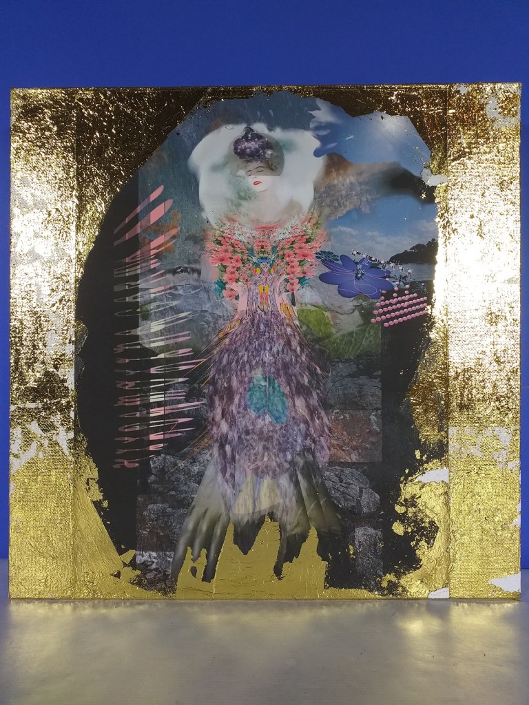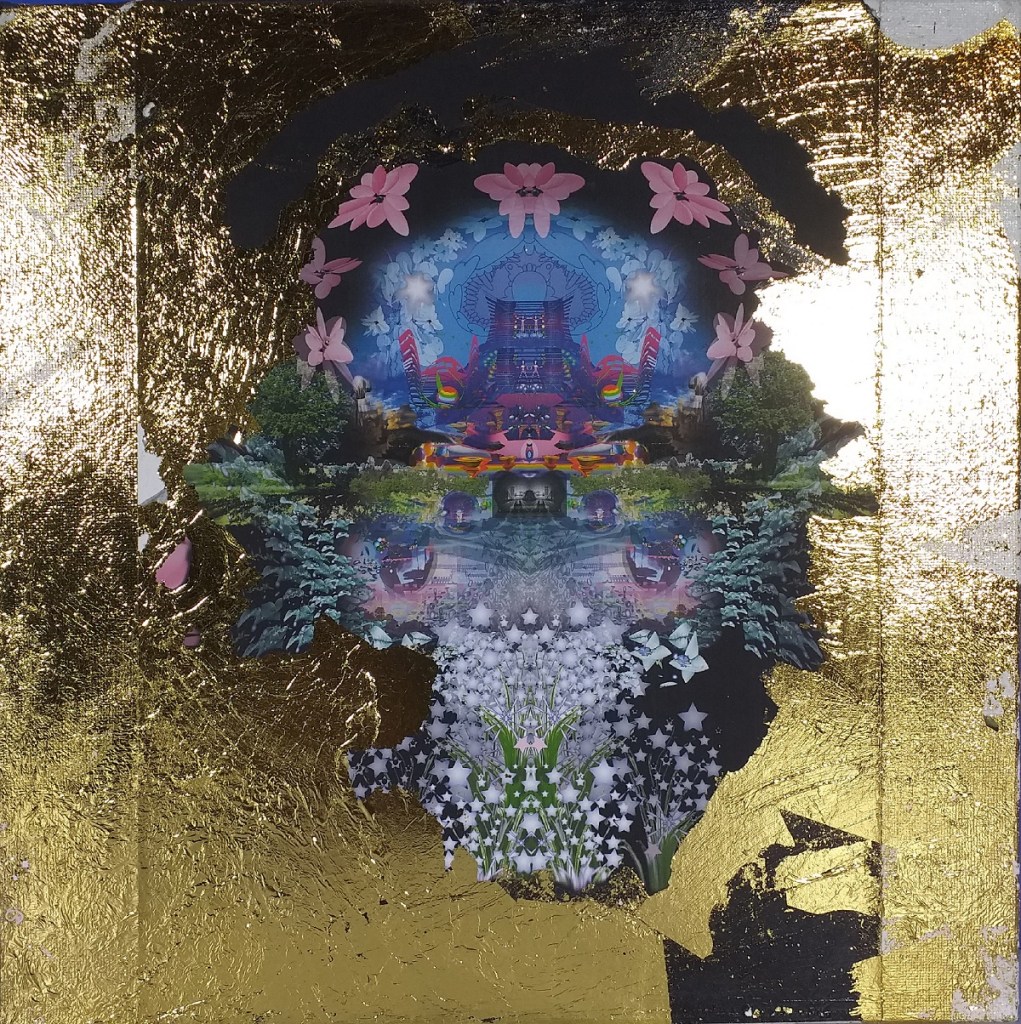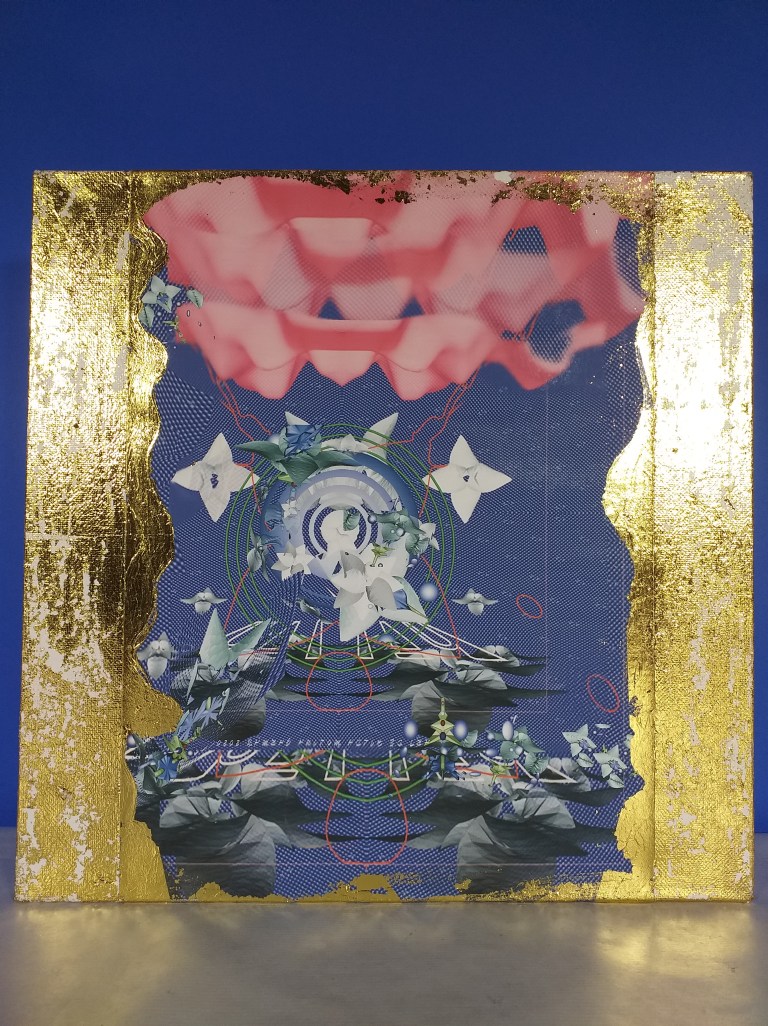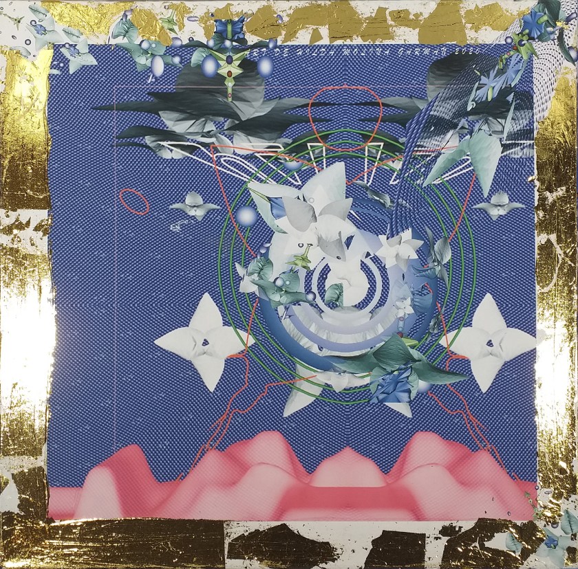 Impression numérique marouflée sur toile et réhaussée à la feuille d’or d’une oeuvre réalisée en 3d par Hilda Garman. 40 cm x 40 cm. 2020.