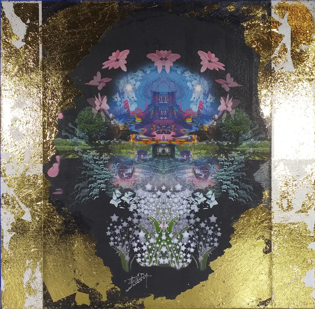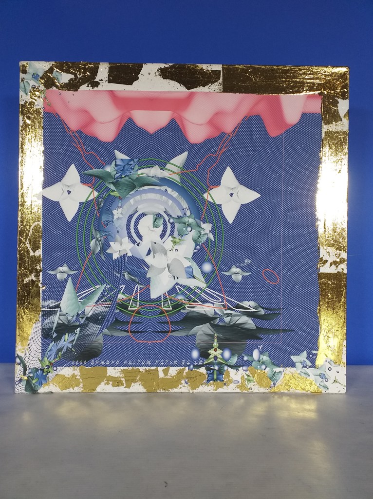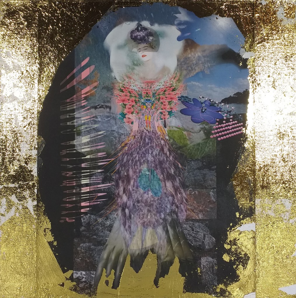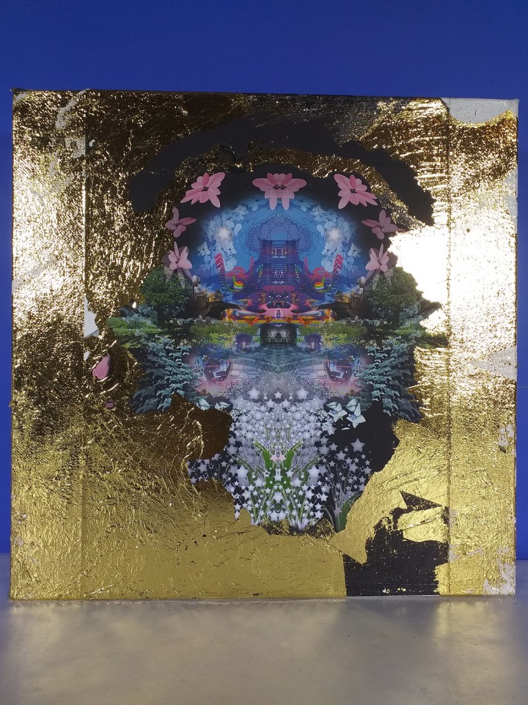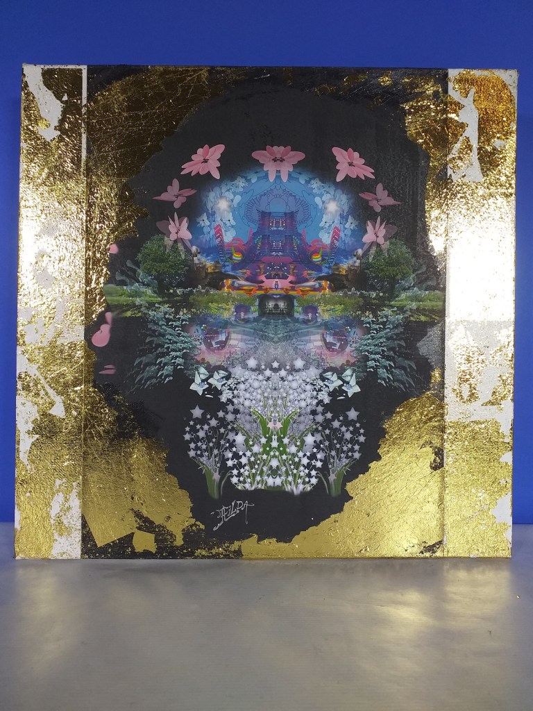 Impression numérique marouflée sur toile et réhaussée à la feuille d’or d’une oeuvre réalisée en 3d par Hilda Garman. 40 cm x 40 cm. 2020.