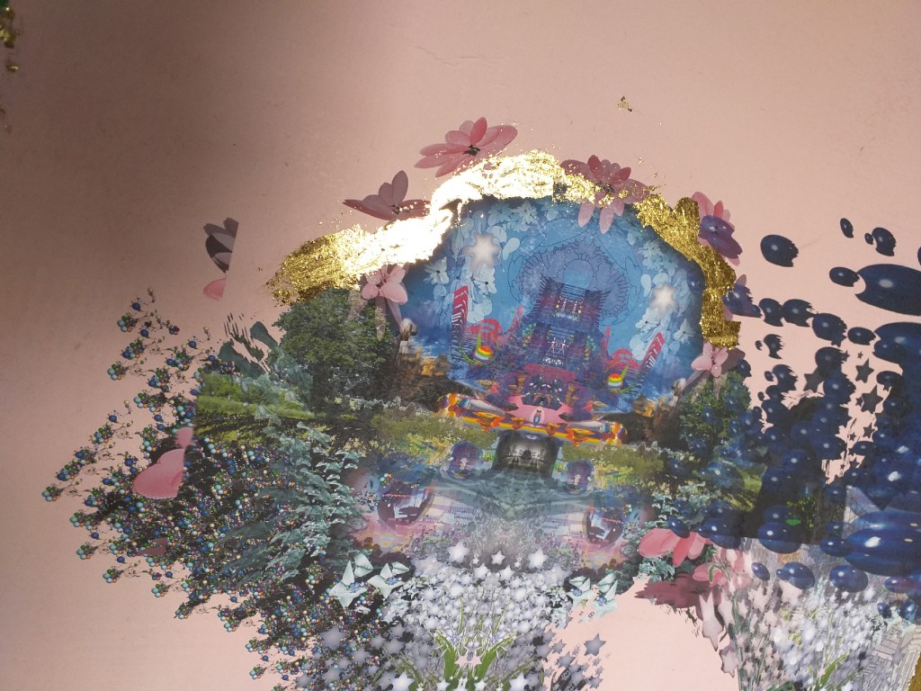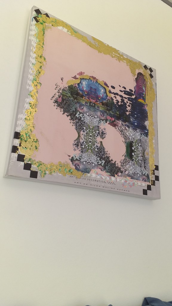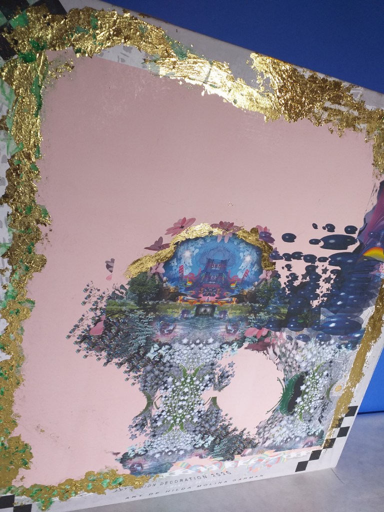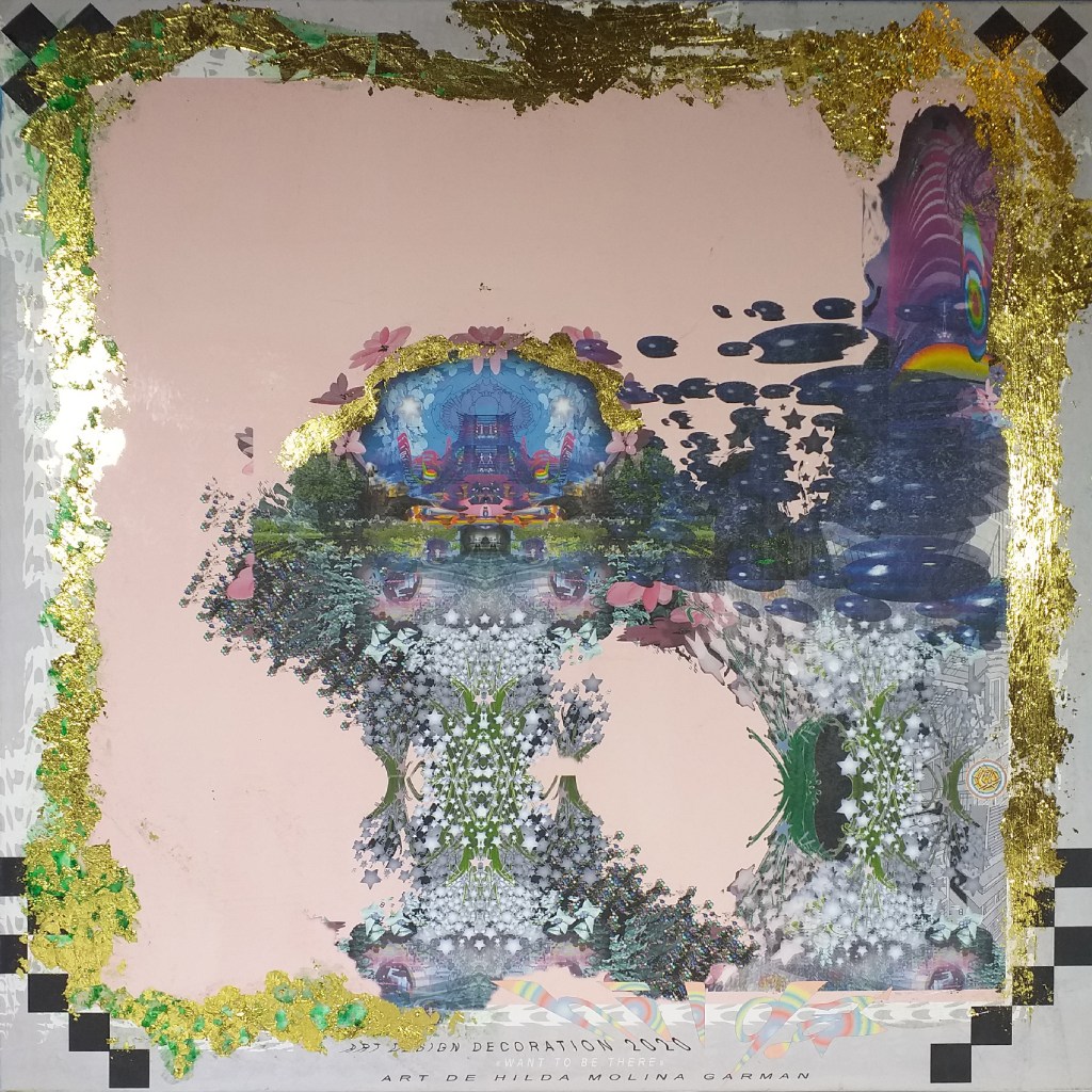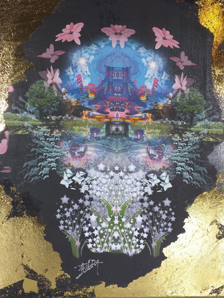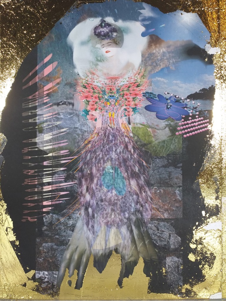Impression numérique marouflée sur toile et réhaussée à la feuille d’or d’une oeuvre réalisée en 3d par Hilda Garman. 40 cm x 40 cm. 2020.