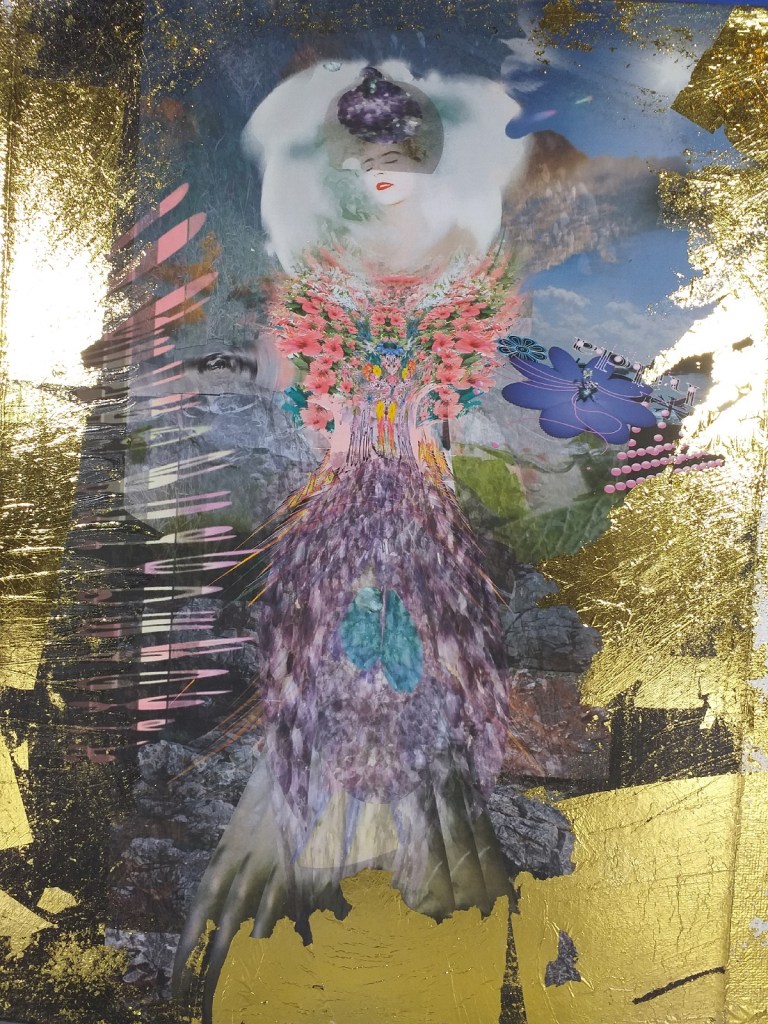 Impression numérique marouflée sur toile et réhaussée à la feuille d’or d’une oeuvre réalisée en 3d par Hilda Garman. 50 cm x 50 cm. 2020.