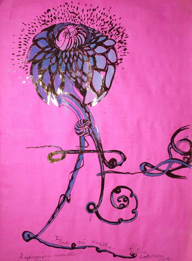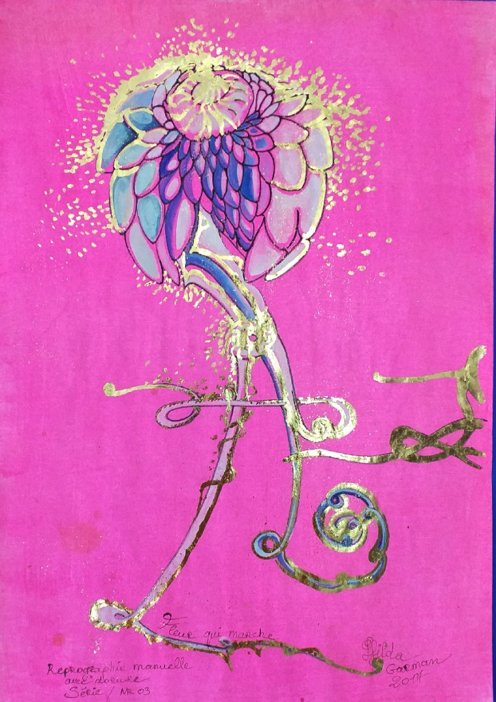 Une fantaisie de fleurs qui marchent une série faite en reprographie manuelle sur un format de 65 CM X 50 CM 220gr . Papier coloré, feutre noir, encre de chine, gouache, dorure feuille d’or. Série limitée avec des variations, signée à l’encre de chine par l’artiste Hilda Garman, de 1 à 7.